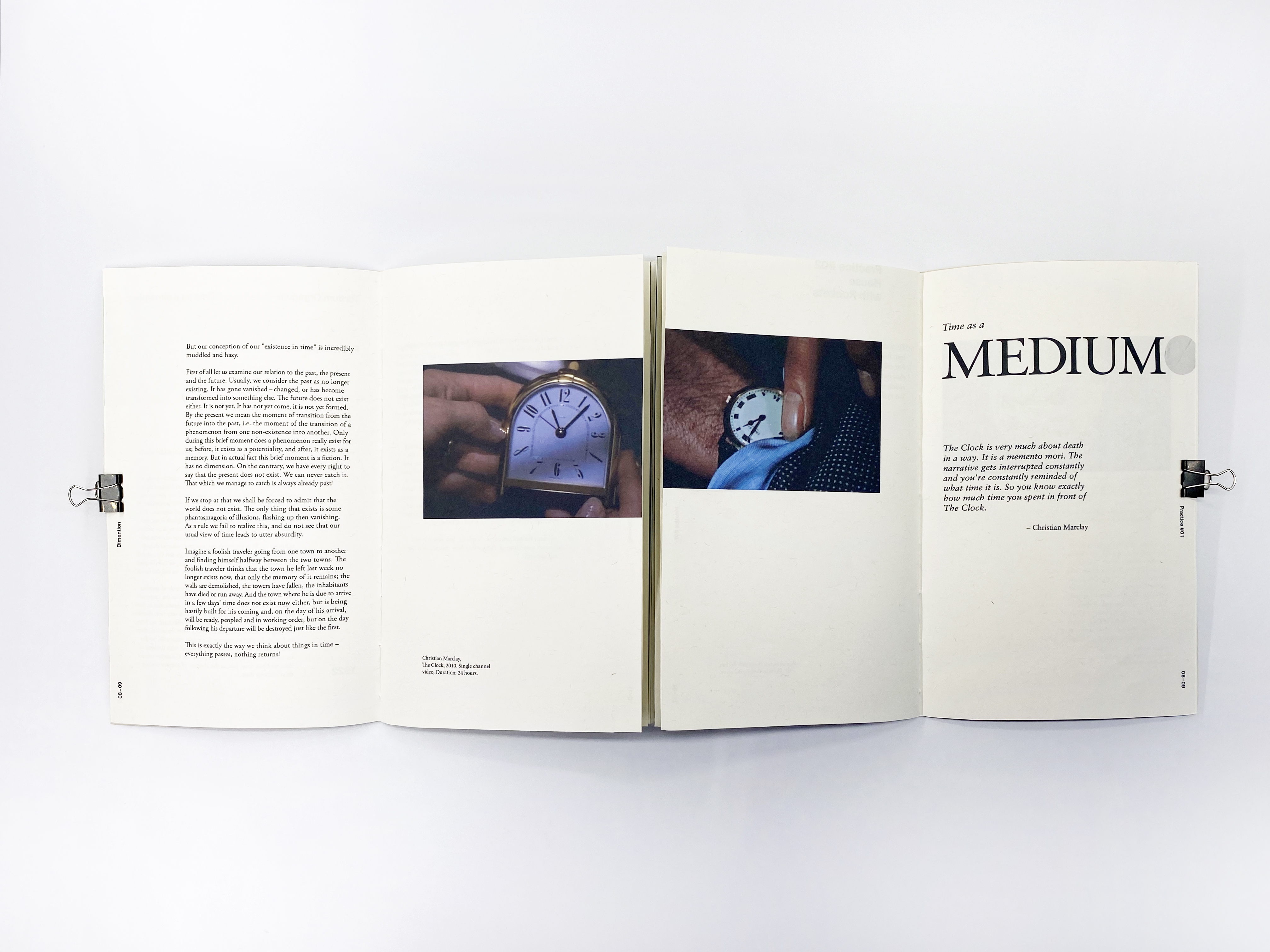 By assembling the information I gathered from my research of time, I decided to create a book of time to express my interpretation of time. According to the concept of “the present moment,” this book requires a certain sense of order, but at the same time has flexibility. I figured out the book’s final presentation is “two books that can be read simultaneously.” This book has two sections that are bound together on an extended cover. The challenge is that the two parts needed to be a finished book separately. Simultaneously, when they are read together, the two sections need to be integrated as a whole.